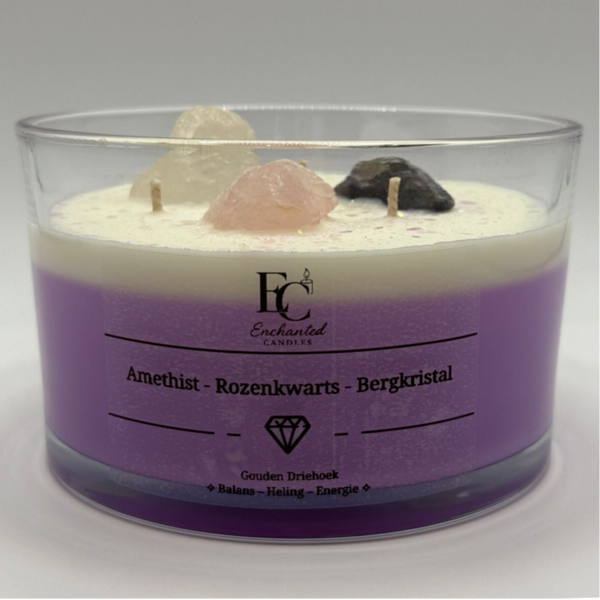 De geur Mystic Aura omhult je met een fijne, spirituele geurbeleving die uitnodigt tot ontspanning en balans. Met zorgvuldig gekozen edelstenen: Amethist, Rozenkwarts en Bergkristal brengt deze kaars niet alleen licht, maar ook positieve energie en liefdevolle bescherming in jouw omgeving.