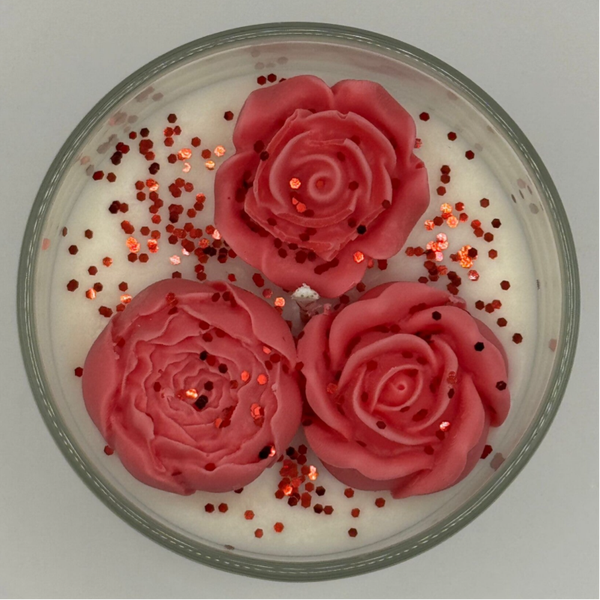 Laat je betoveren door de zachte geur van vanille, gecombineerd met een prachtig witte basis die schittert met sprankelende rode glitter en echte rode rozen als decoratie. Elke roos is uniek, net als een vers boeket dat met liefde is samengesteld.