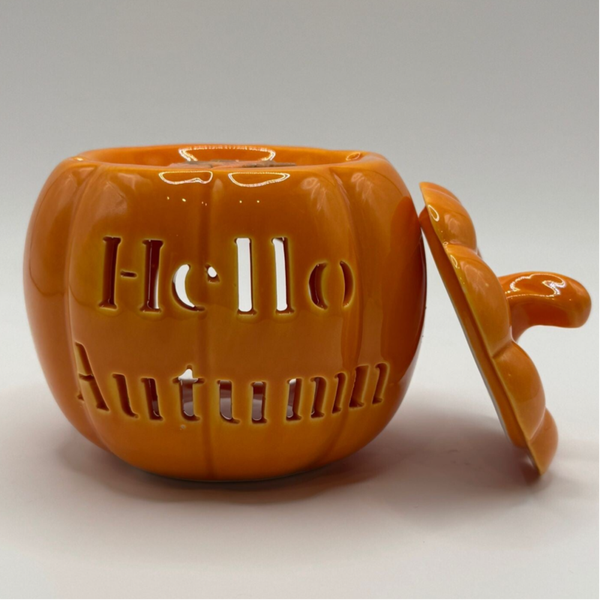 Verwelkom de gezelligste tijd van het jaar met onze Hello Autumn Geurbrander. Deze warme oranje keramieken pompoen met uitgesneden tekst verspreidt een zacht, sfeervol licht zodra je er een waxinelichtje in plaatst.